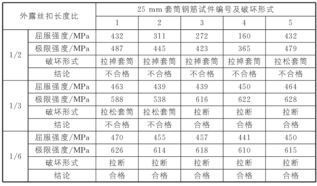表2 不同外露絲頭長度時,直徑25 mm套筒鋼筋抗拉實驗結(jié)果及破壞形式